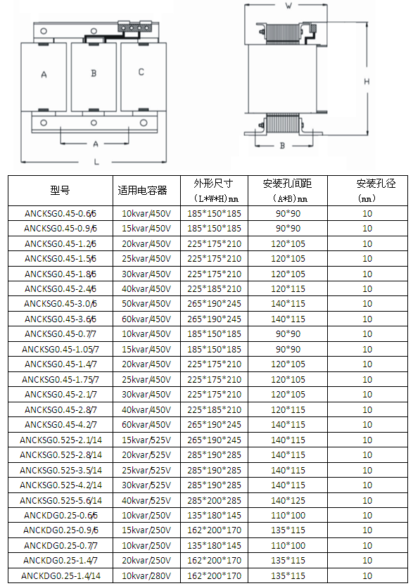 ANCK系列串聯電抗器與ANBSMJ系列自愈式低壓并聯電容器配套使用,主要用于提高0.4kV電力系統的功率因數,有效抑制電網的高次諧波,減輕電容器由諧波引起的過載,防止諧波放大,對電容器的安全運行,改善網絡電壓波形,提高供電質量和電網安全經濟運行起良好作用。