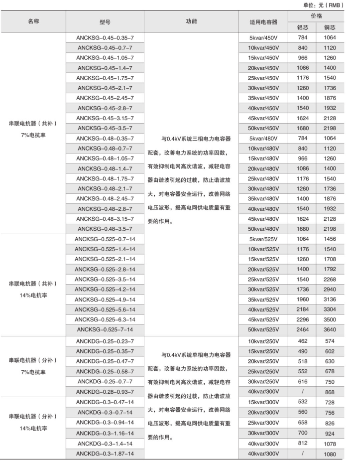 技術要求:適用電容器5kVAR;7%電抗率;銅芯