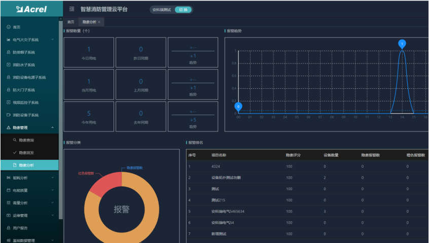 智慧用電子系統(tǒng)可以接入電氣火災(zāi)、孤航電弧、電氣火災(zāi)主機、滅弧式保護器探測器和無線測溫探測器等。點擊智慧用電子系統(tǒng)進入智慧用電監(jiān)控頁面,點擊第一級顯示整個項目的基礎(chǔ)信息和該項目下的所有探測器的信息,點擊末級節(jié)點顯示具體探測器的監(jiān)控頁面。
