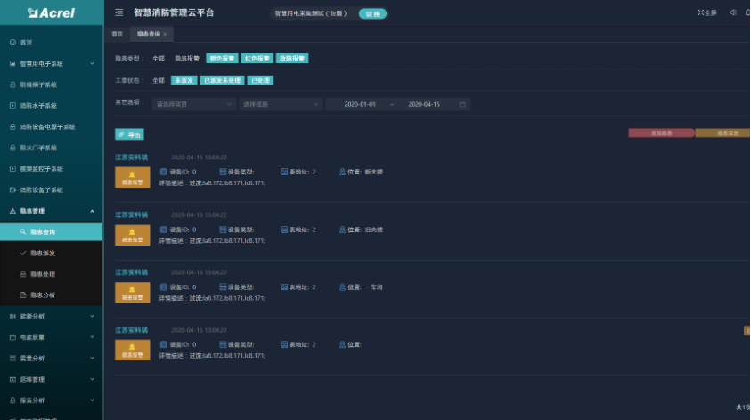 隱患管理功能包括了隱患查詢、隱患派發(fā)、隱患處理和隱患分析四個模塊。可以查看登錄用戶下的所有項目的隱患信息,并進行派發(fā)和處理操作,且對所有隱患進行統(tǒng)計分析。